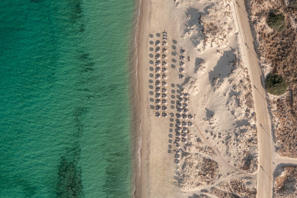 Experience authentic Greek cuisine at our seaside restaurant, where you can savor breakfast, lunch, or dinner while enjoying breathtaking views of the endless blue sea from tables nestled on the sandy beach, complemented by discreet lighting during the afternoon and evening.