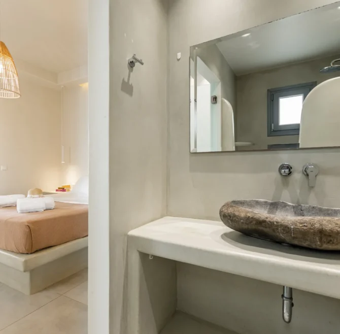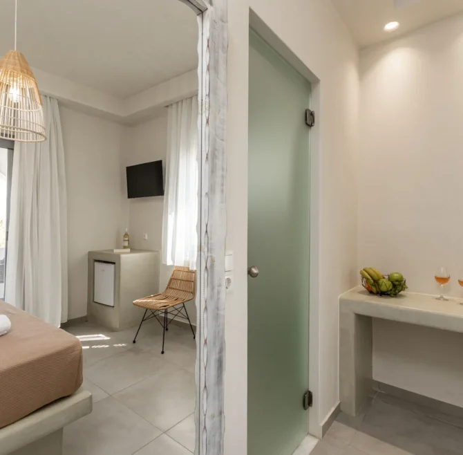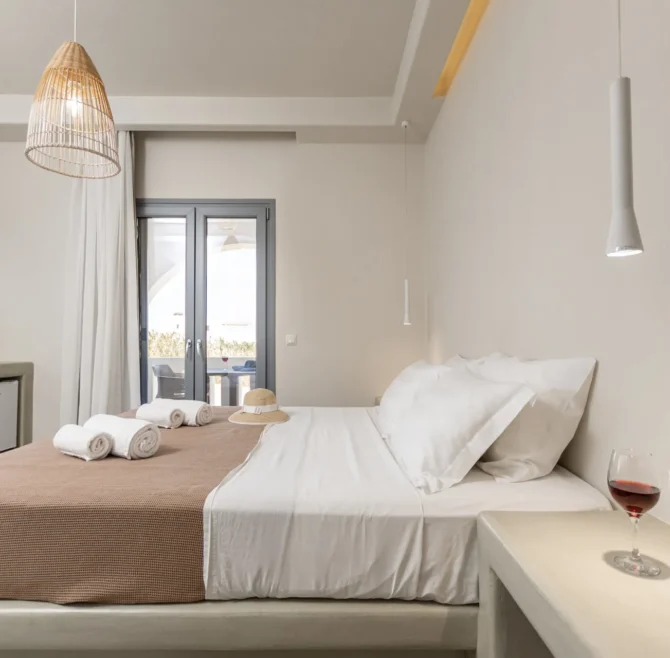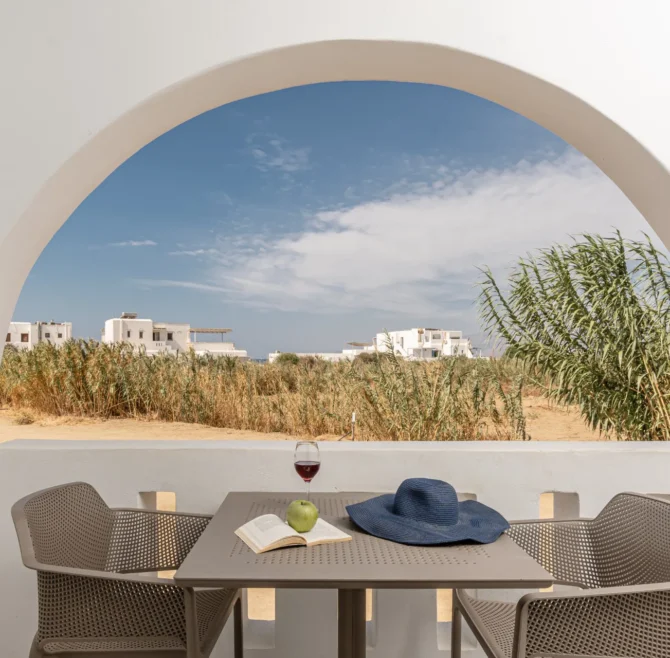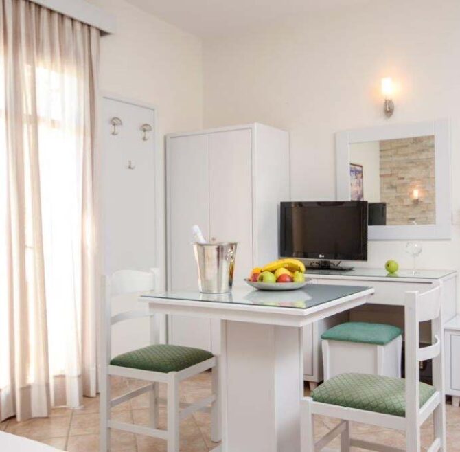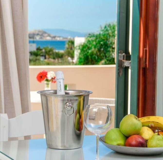 All rooms have a balcony overlooking the turquoise waters of Plaka Beach and are modern, bright and airy. They provide all the amenities one needs for a comfortable stay, such as a private bathroom, a kitchen, air conditioning, internet access and TV.