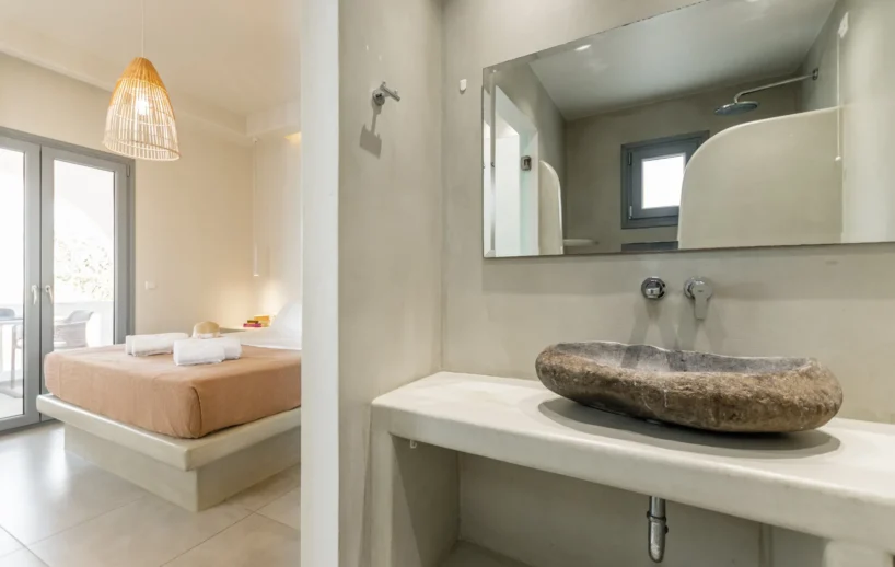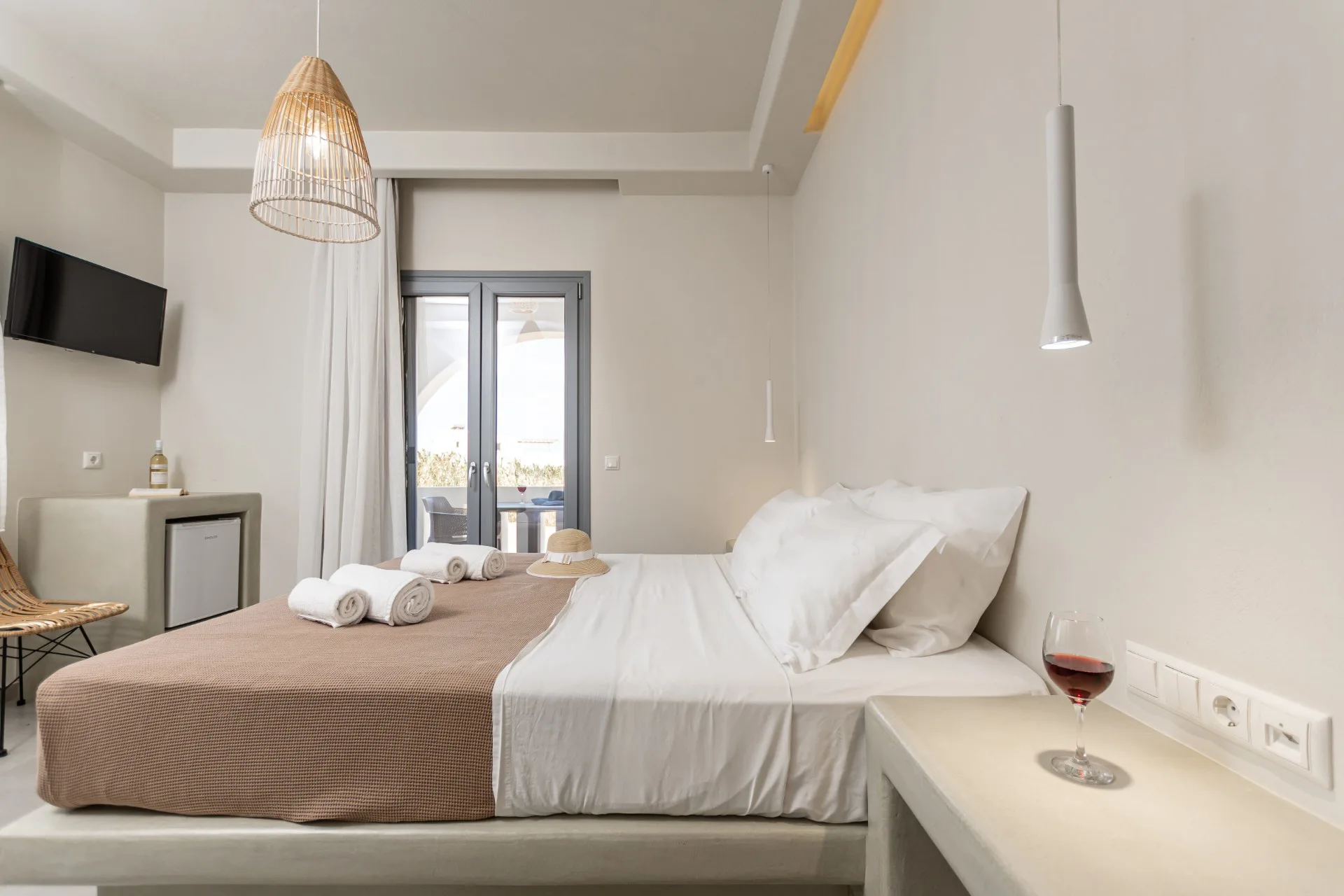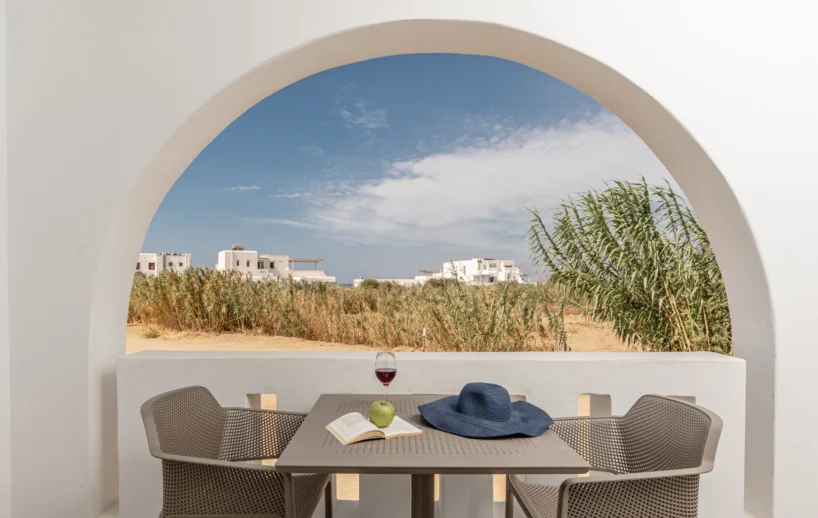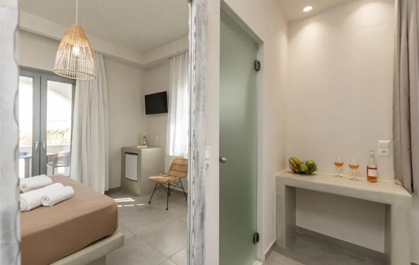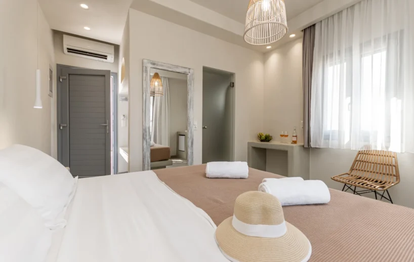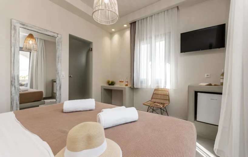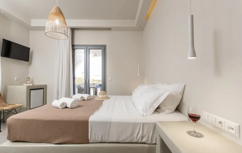 The Superior Double Room has a floor area of 20 sq.m and features a double bed with a comfortable mattress and a spacious balcony with a fantastic sea view.